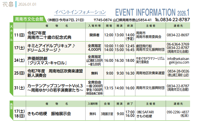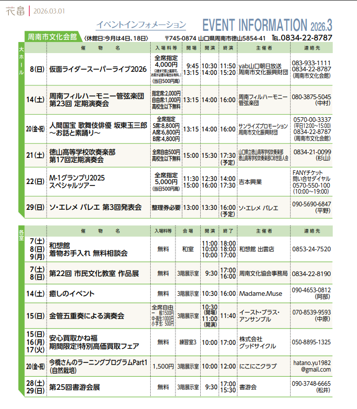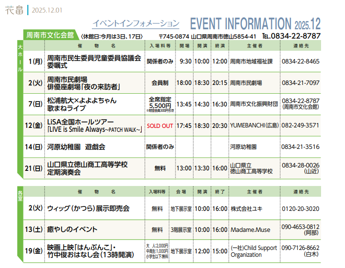 TEL.0834-22-8787 /FAX.0834-22-8790 休館日.毎月第1・3水曜日及び12/29〜1/3